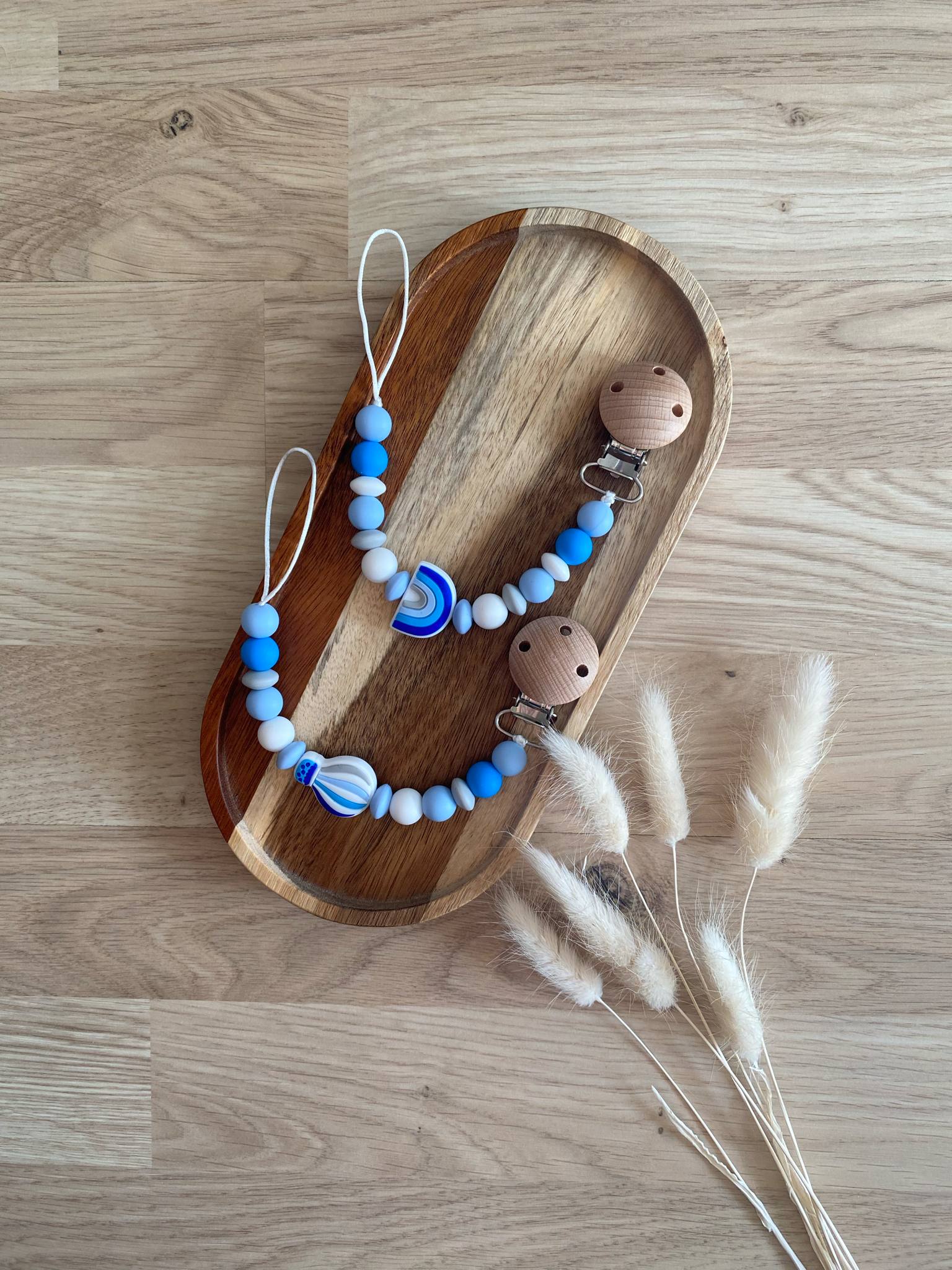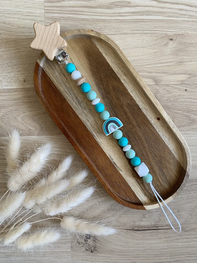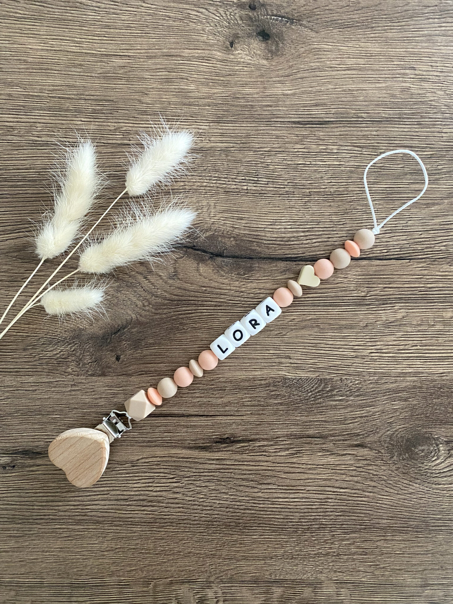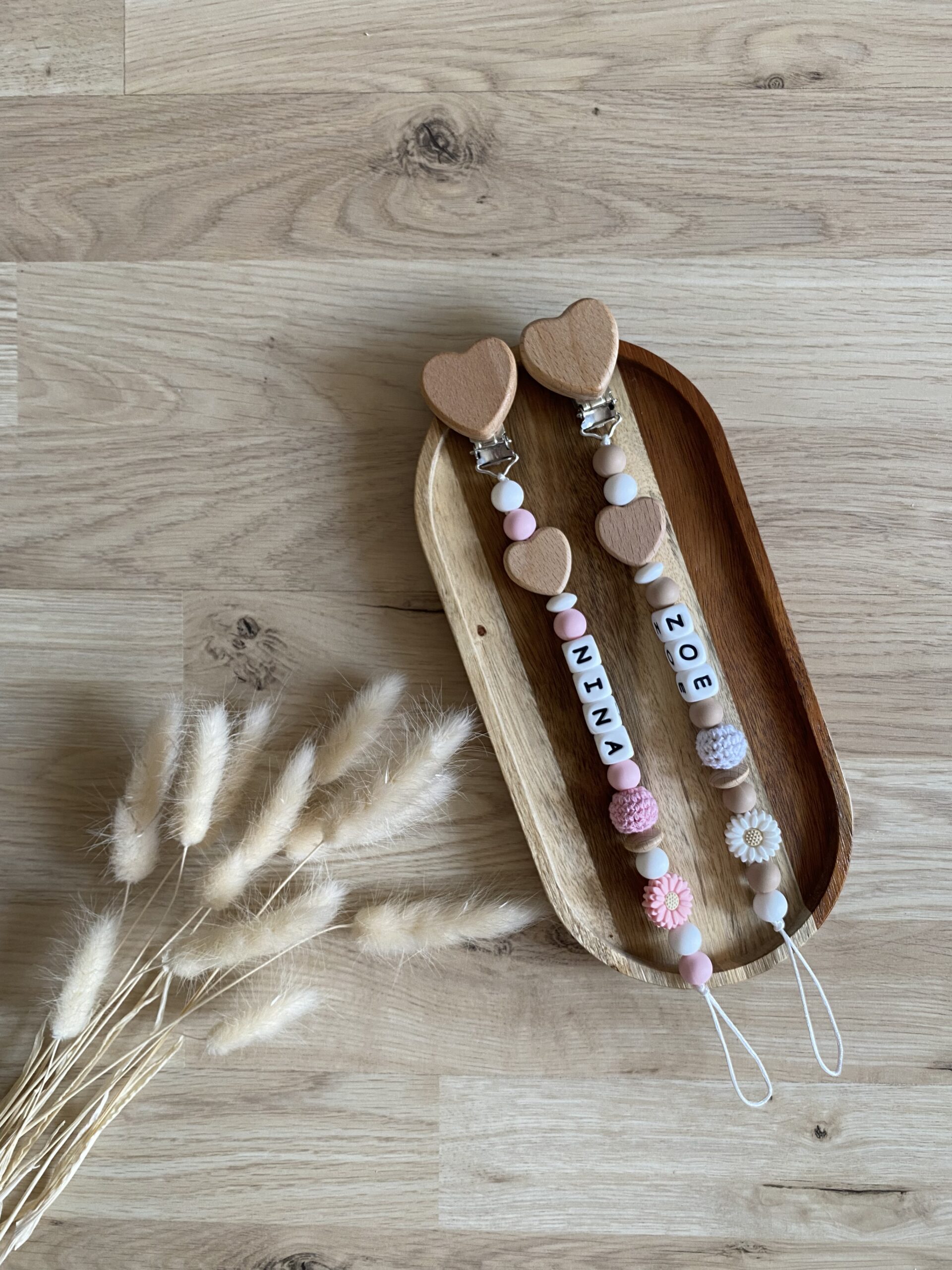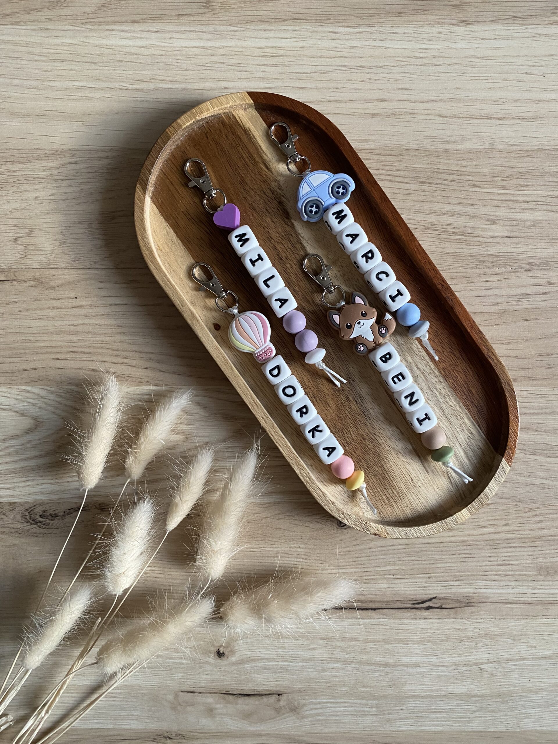Készleten lévő, azonnal vihető cumi- és rágcsaláncok. Rendelhető más színekben is, vagy akár a baba nevével is!